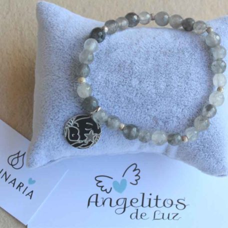 Pulsera de piedras minerales de colores, con bolitas de plata mates intercaladas. Lleva Medalla de Plata de Ley 925, con la imagen de una maternidad recibiendo la estrella de Luz de su Bebé.