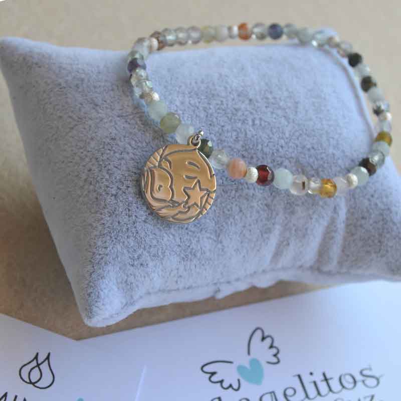 Pulsera de piedras minerales de colores, con bolitas de plata mates intercaladas. Lleva Medalla de Plata de Ley 925, con la imagen de una maternidad recibiendo la estrella de Luz de su Bebé.