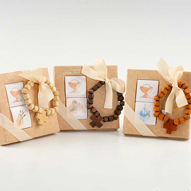 Te presentamos la Pulsera Rosario de Madera, junto con un estuche con dos napolitanas de chocolate especiales de Primera Comunión.