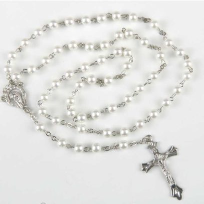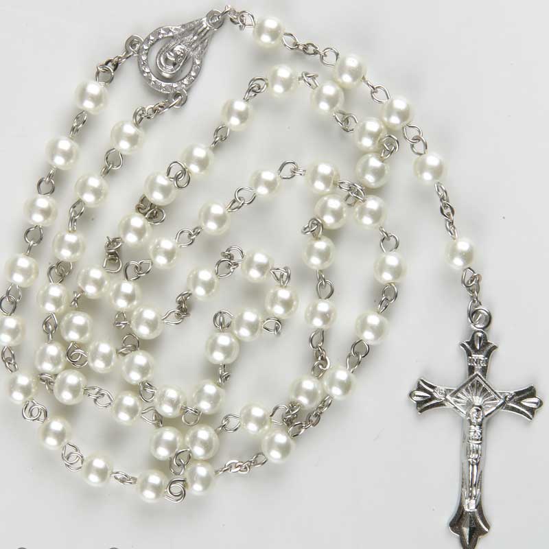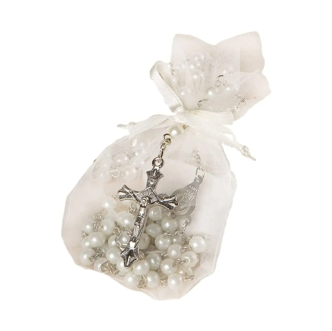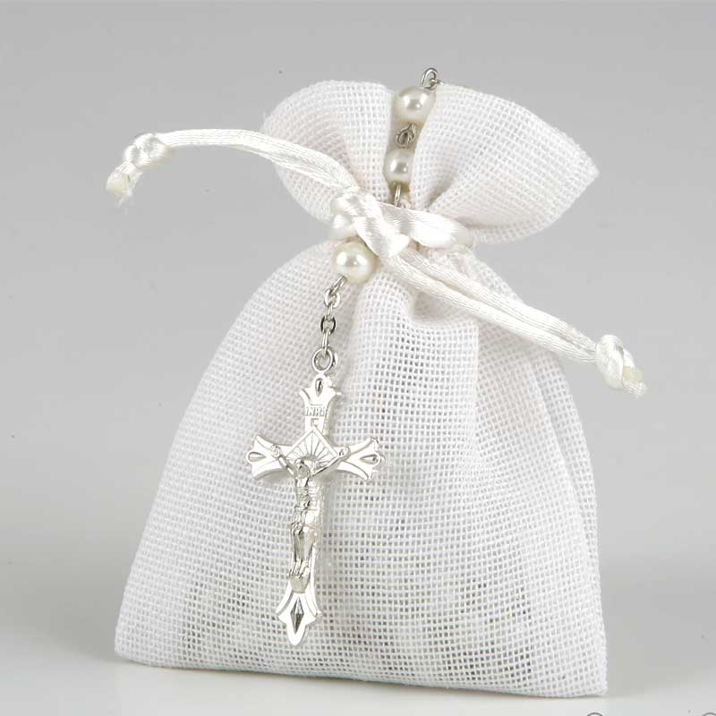 Te presentamos nuestro Rosario de Perlitas, en un saquito blanco con cordoncito de seda, para guardarlo y conservarlo siempre.