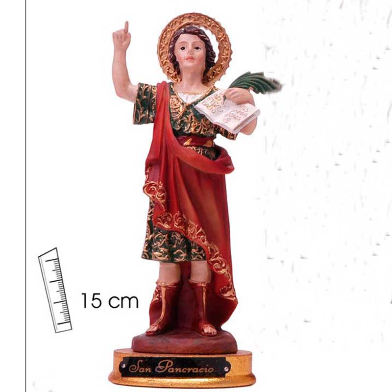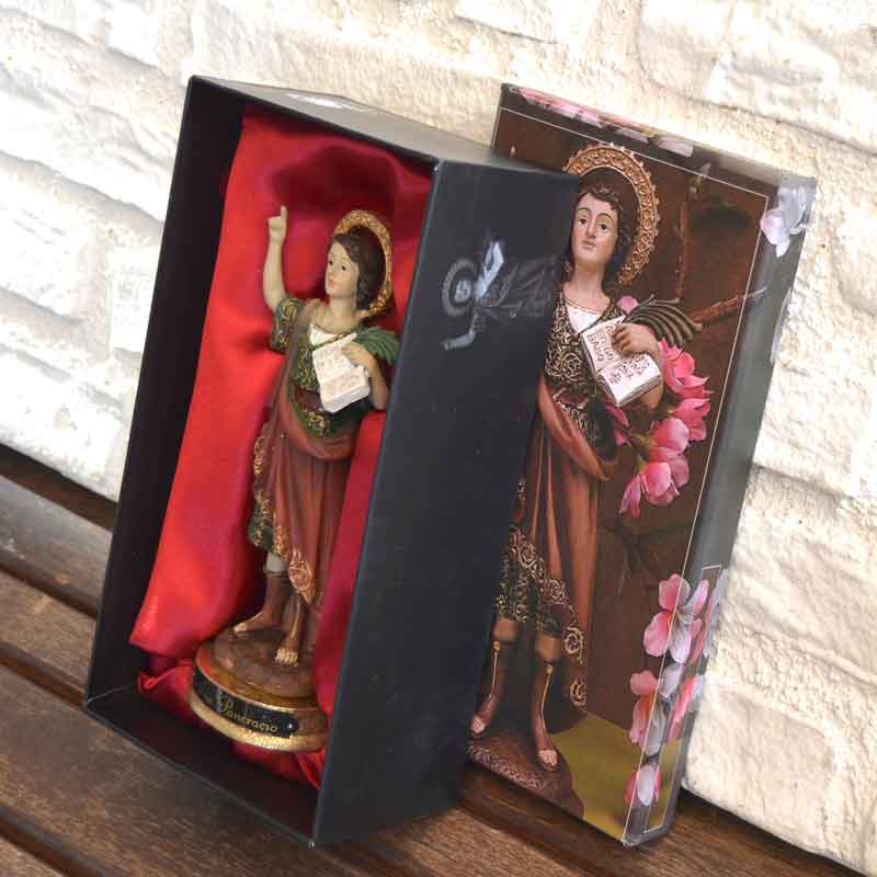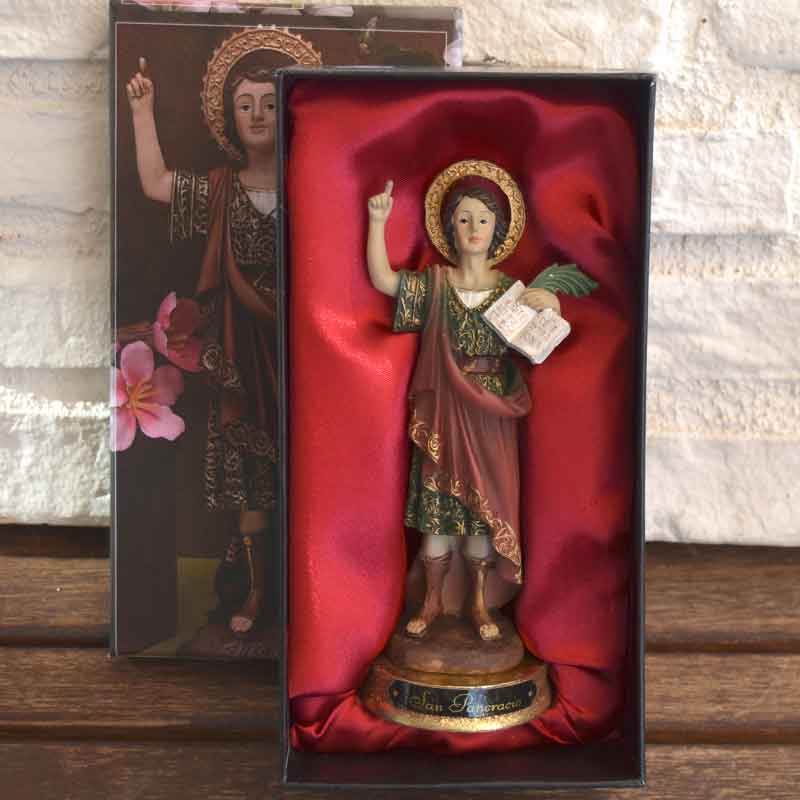 Elegante figura de San Pancracio, de 15 cms de altura, presentada en un precioso ESTUCHE DE REGALO ESPECIAL dedicado al Santo. Lo presentamos en el estuche especial de regalo porque la figura de San pancracio, HA DE SER REGALADA, según se cuenta para que traiga suerte y hay que ponerle PEREJIL, simplemente unas ramitas sobre su imagen.
