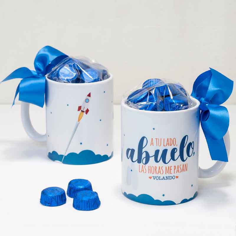 Es apta para microondas y lavavajillas. La enviamos en caja kraft de regalo y además puedes elegir la opción de taza con decoración de lazada en el asa y rellena de 6 bombones de chocolate con leche.