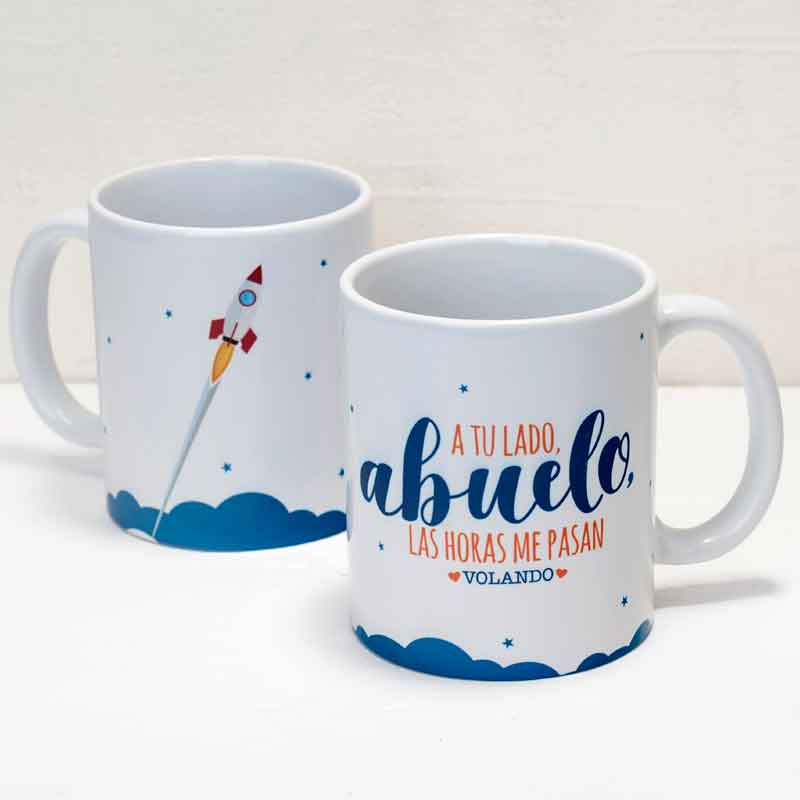 Taza Mug «Contigo Abuelo» las horas se me pasan volando, un bonito detalle de agradecimiento para nuestro padre y abuelo, seguro que aciertas, por la intención tan maravillosa y el simpático y bonito diseño de esta taza.