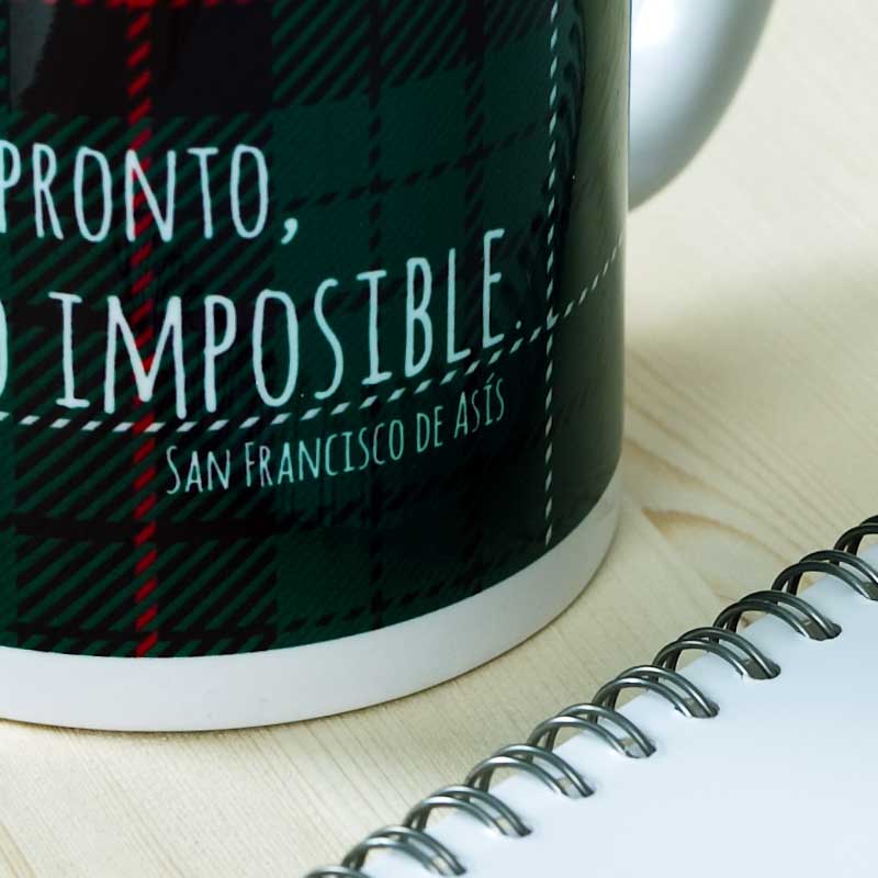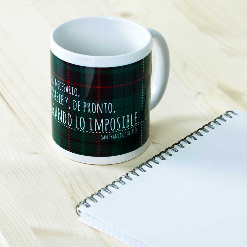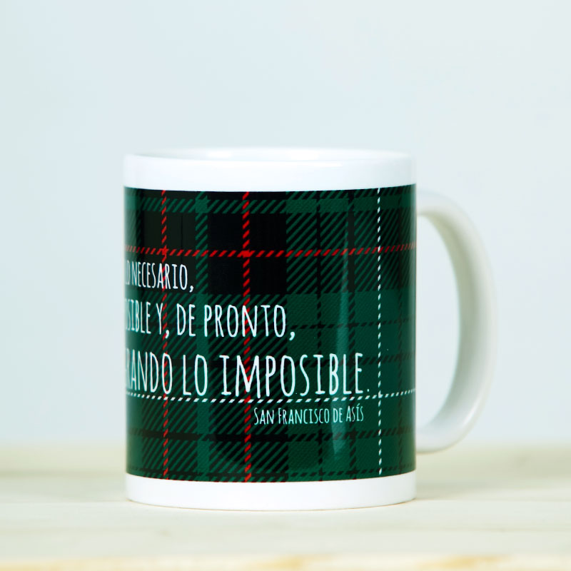 Taza «Francisco de Asís» de cerámica, impresa en escocés verde a todo color.