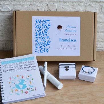 Lleva impreso en color azul el nombre del Niño y la fecha de la Primera Comunión, enmarcados en una bonita y alegre guirnalda verde.