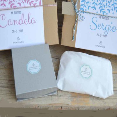 Se presenta en pack de regalo en moderna caja kraft, con etiqueta personalizada con el nombre del niño/a y la fecha opcional si se desea del bautizo o nacimiento. Un original y estupendo regalo para Madrinas, Tíos, Familiares y amigos del recién nacido.