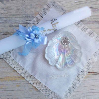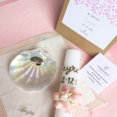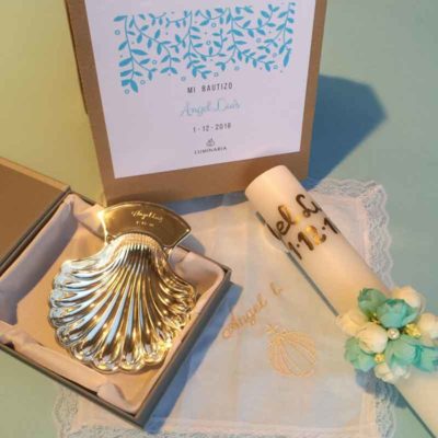 No dejes de consultar nuestro producto del Pack de Bautizo Nacar personalizado completo, pues lleva todo lo necesario para la ceremonia de Bautizo a un precio estupendo en una bonita caja de regalo en la que podrás guardar todas las cosas una vez pasada la ceremonia. Contiene la Concha Bautismal Nacar, El Cirio personalizado con su bouquet de flores y el Pañuelo Bautismal bordado con el nombre.