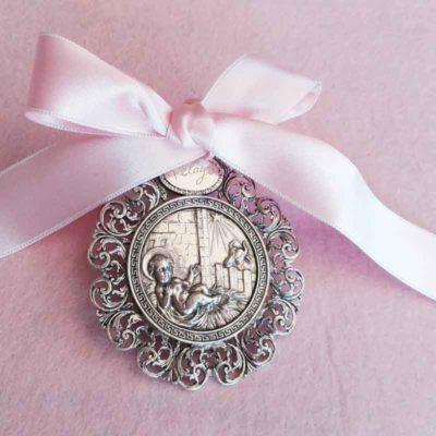 Medalla de Plata «Angelito Bracitos»., confeccionada en plata de ley 925 , acabado en brillo y mate, con pulido espejo. Perteneciente a la colección de Luminaria «Angelitos de Luz».